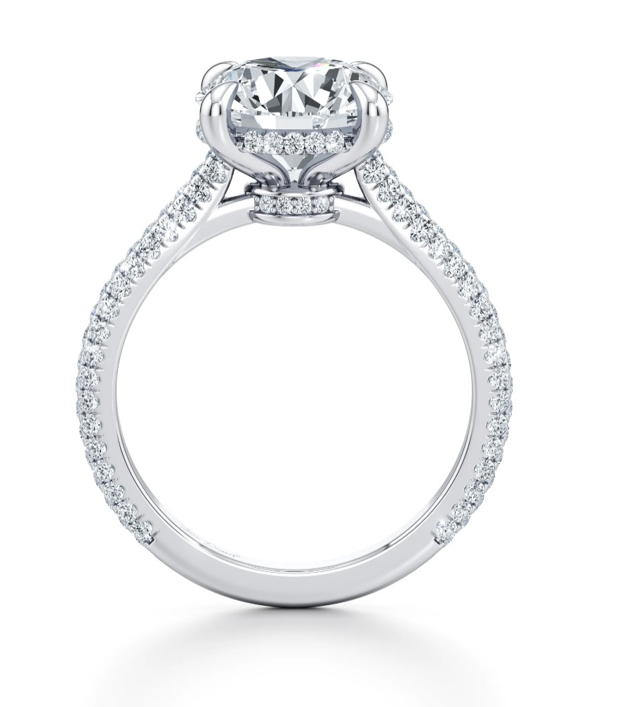 • Side Stones: Round Pavé Diamond Accents (three-row setting)