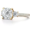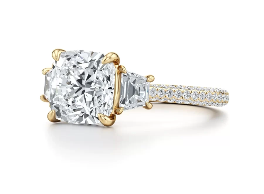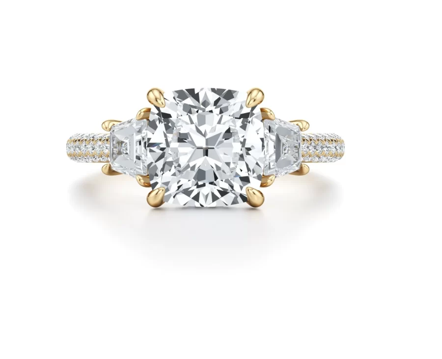 371 reviews for Chelseia — 1.50 Carat Cushion-Cut Lab Diamond Three-Stone Engagement Ring with Trapezoid Side Stones & Triple Pavé Band
