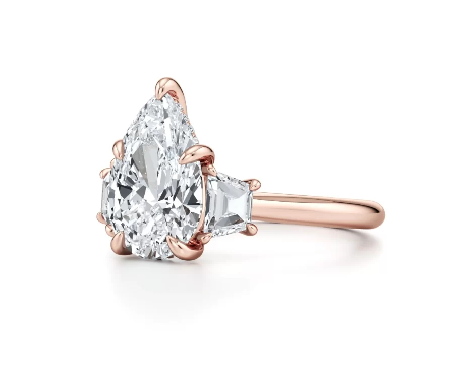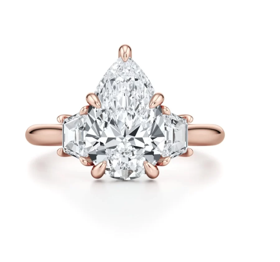 Chelseia elevates the classic three‑stone silhouette into an architectural masterpiece. At its heart, a 4.00 carat pear‑shaped lab‑grown diamond, ethically selected from the top 1% of lab diamonds, radiates brilliance with elongated elegance. This center gem is perfectly balanced by two trapezoid side stones, whose precision cuts amplify light and symmetry in every glance.