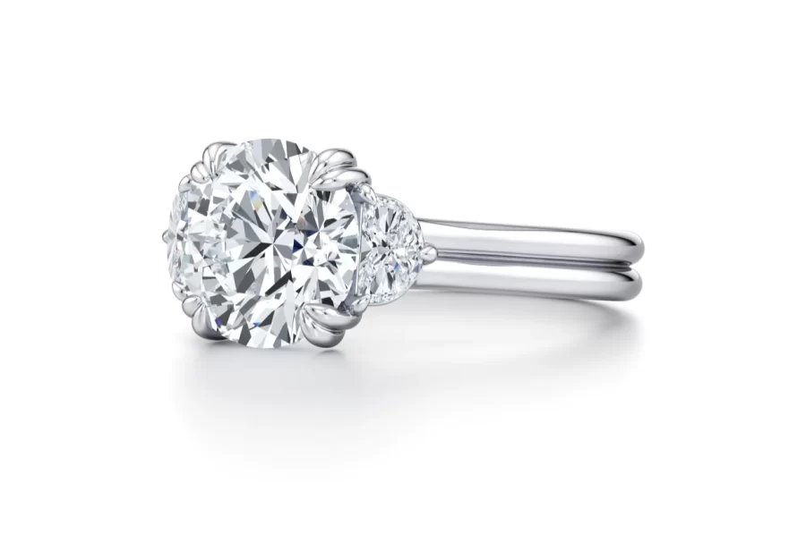 “Three-stone engagement ring featuring a lab-grown center diamond and two half-moon side stones in a double-prong setting, finished with a dual-row high-polished band—Jennifer by Ella Landon.”