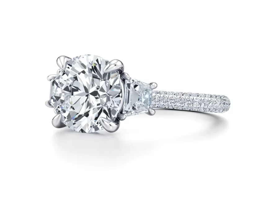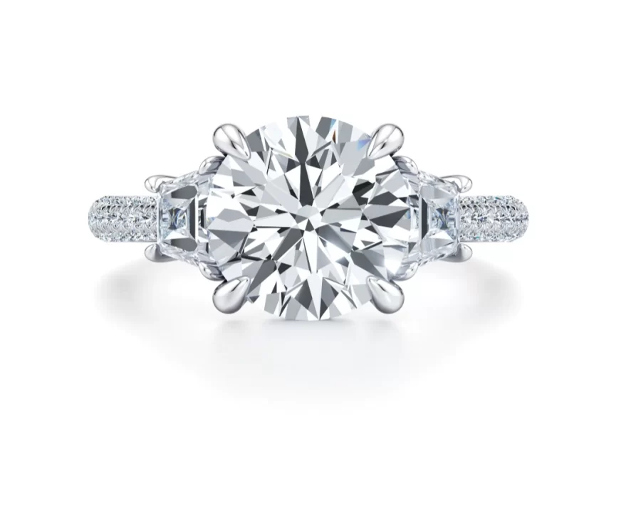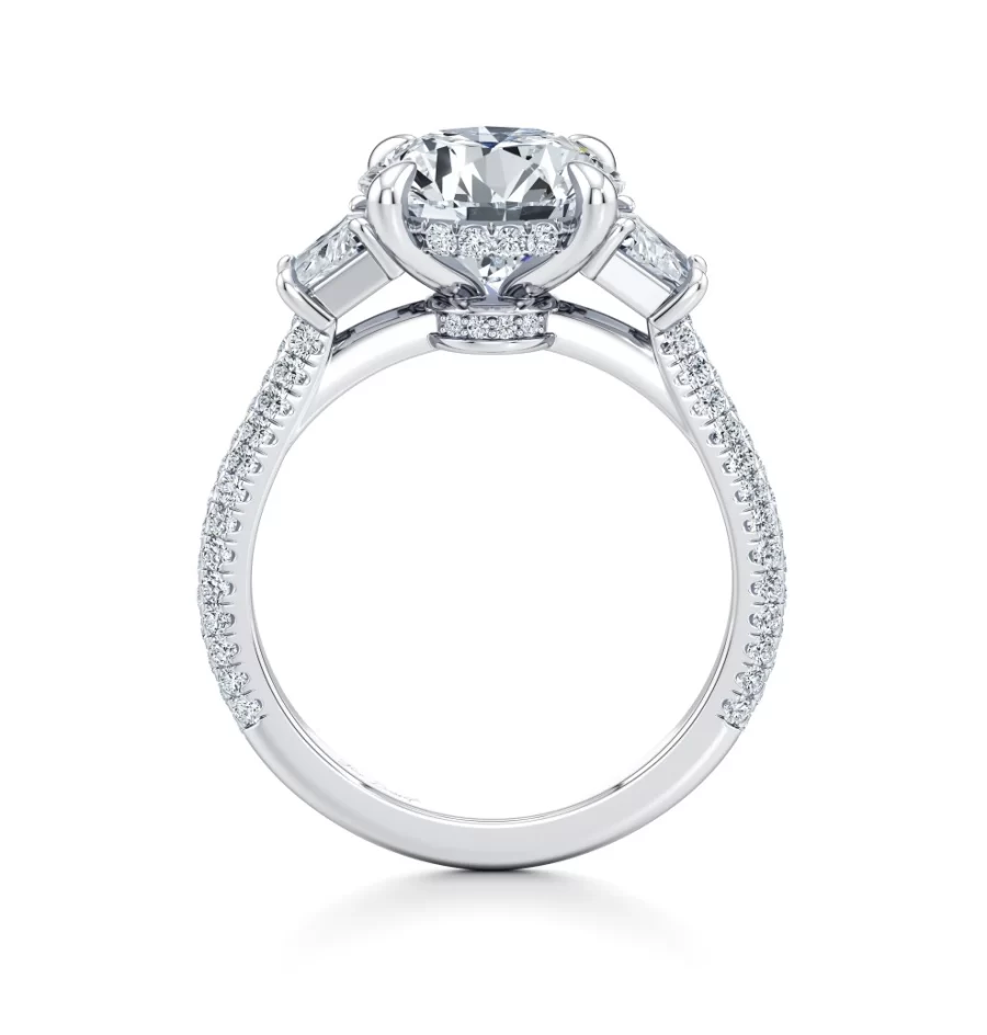 Experience unparalleled brilliance and refined craftsmanship with the Marissa 5.00 carat round brilliant lab-grown diamond three-stone engagement ring, a true masterpiece of modern luxury. Sourced from the top 1% of ethical lab-grown diamonds, this breathtaking center stone is perfectly cradled by twin trapezoid side stones, expertly cut to enhance symmetry and maximize radiant fire.