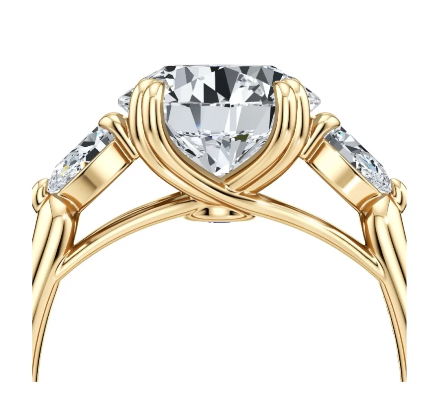 Elevate your love story with the Marriah Ella Three-Stone Lab-Grown Diamond Engagement Ring, a breathtaking symbol of commitment, crafted with ethical lab-grown diamonds from the top 1% of the industry. Designed by our master jewelers, this luxury engagement ring combines the brilliance of a 2.00 ct round brilliant center stone with the elegance of two 0.25 ct pear-shaped side stones, all set in an exclusive double-prong setting.
